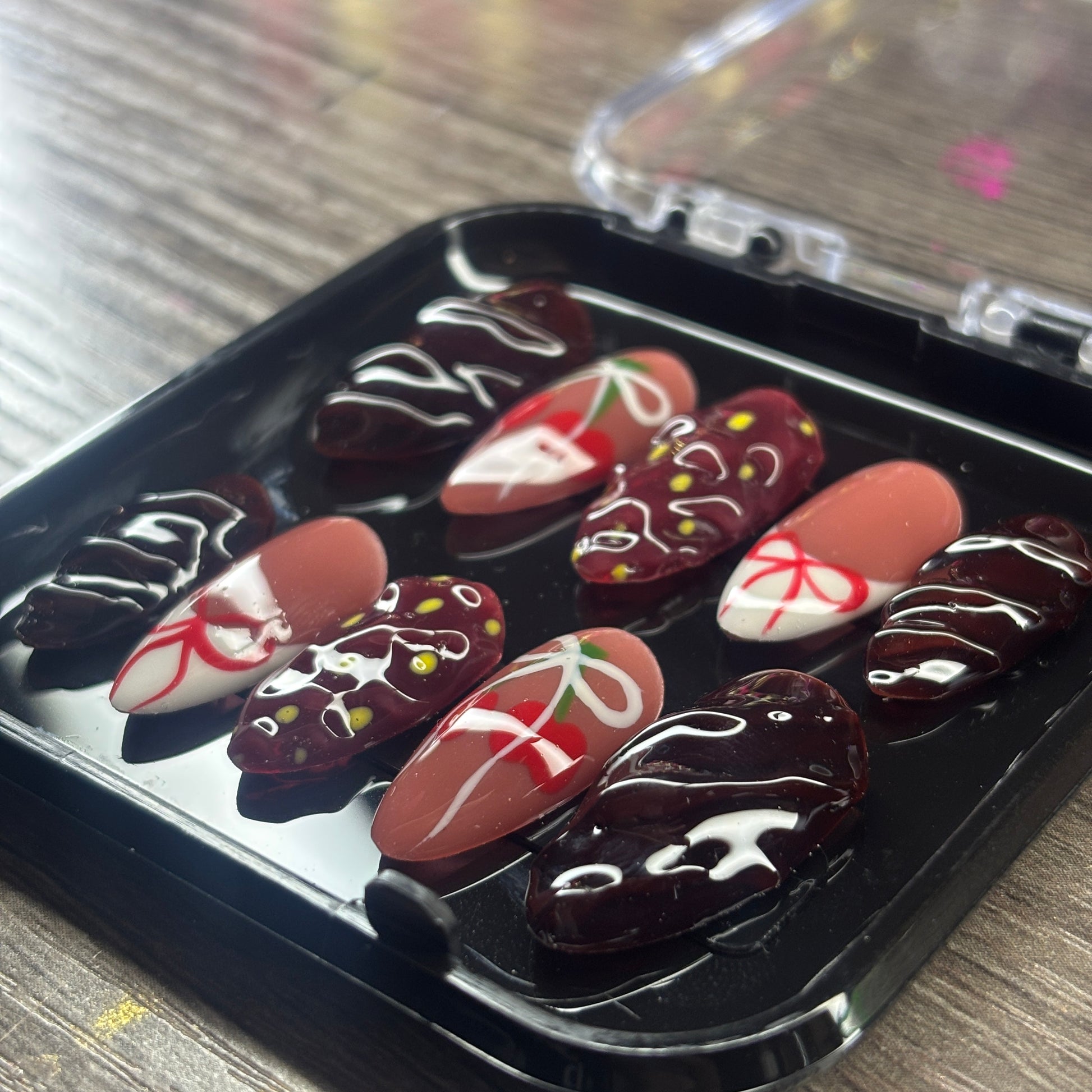 Get ready to nail Valentine’s Day with The “Syeeda” Set! These press-on nails come adorned with chocolate, strawberries, and bows—talk about sweet! With 3D accents and a durable design, you'll be looking fab without a fuss (because who needs a salon when you can DIY?). Perfect for a romantic dinner or just a cozy night in—love is in the air (and on your fingertips)!
