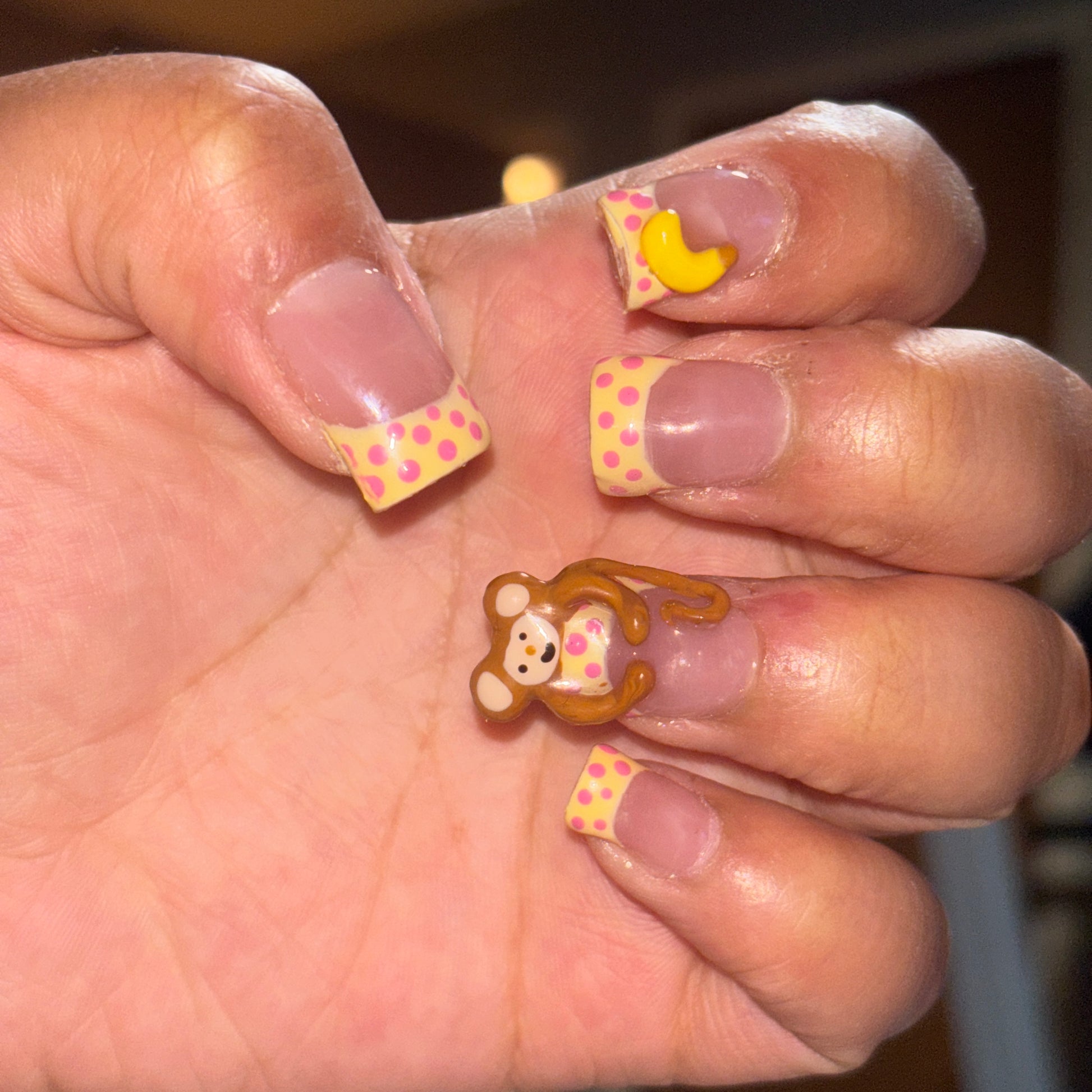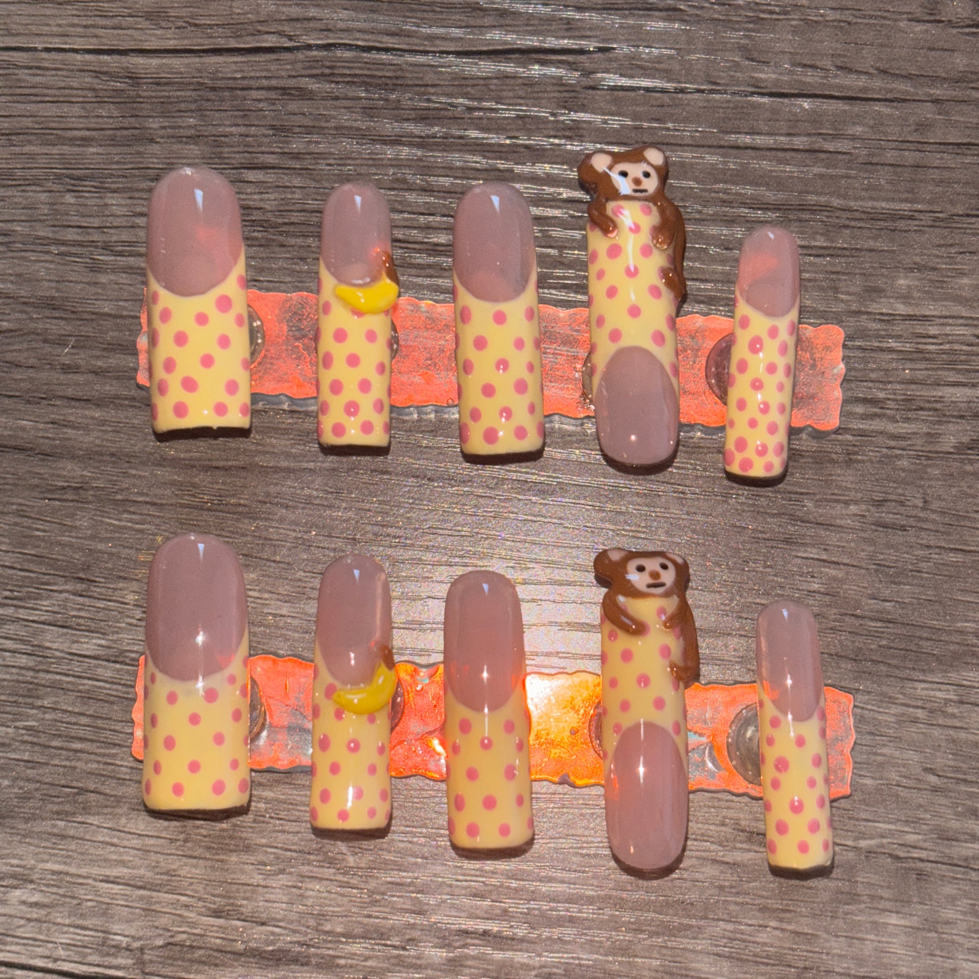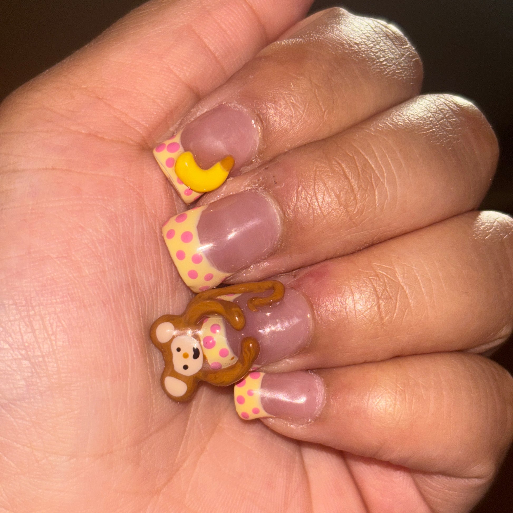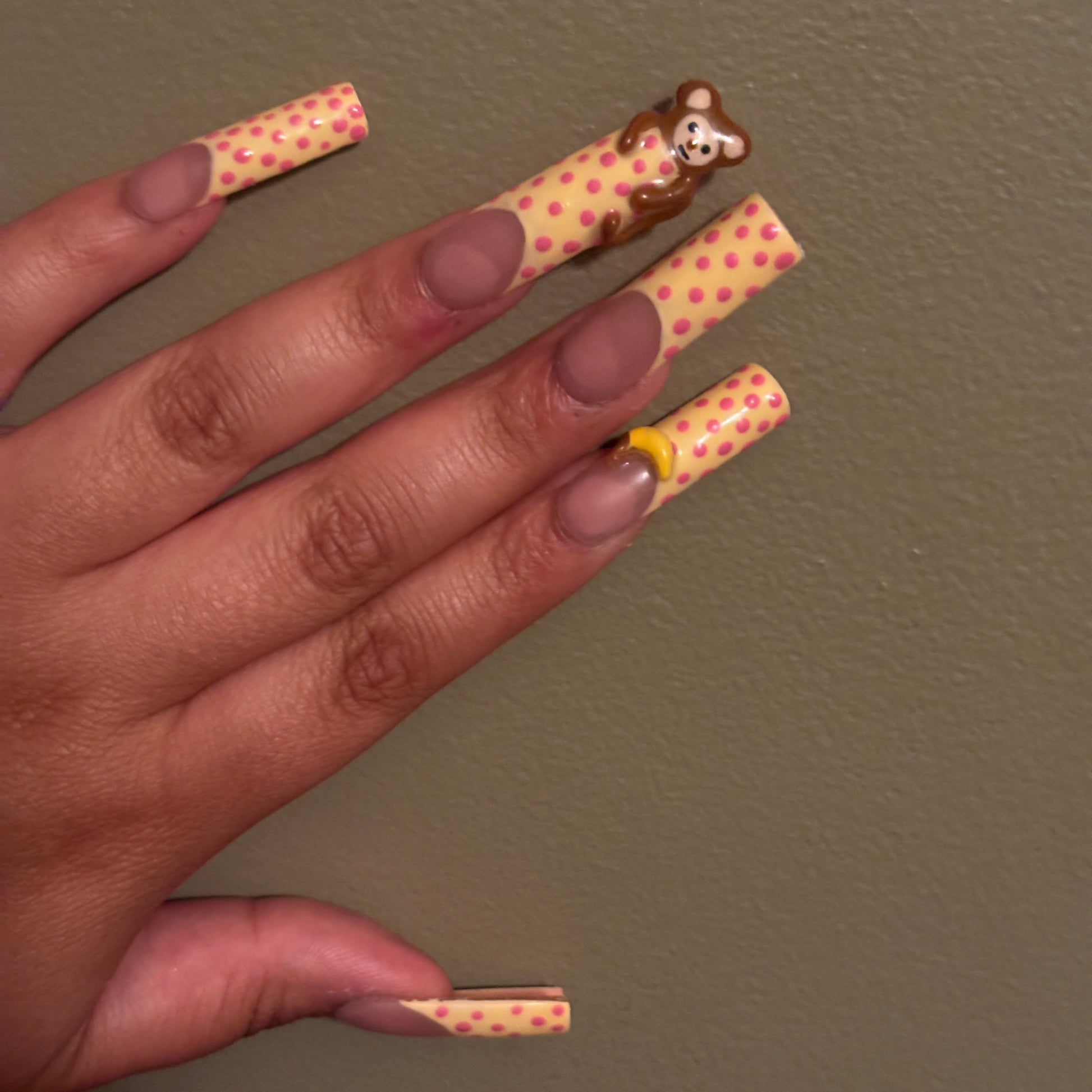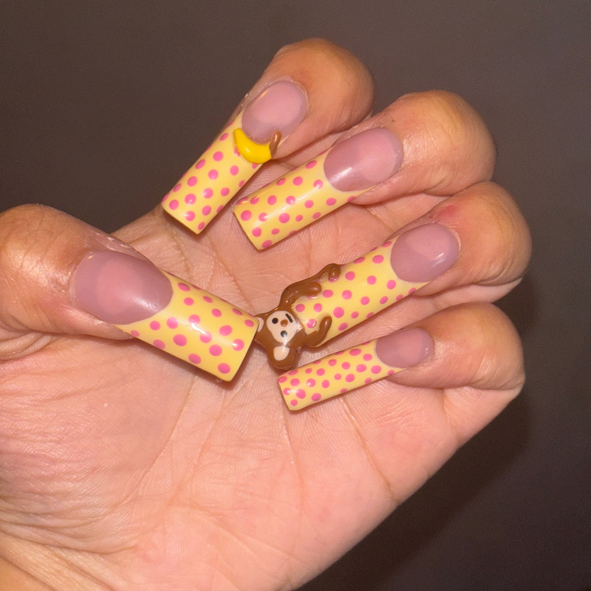 Brighten your look with The "Charlie" Set—funky yellow French tips dotted with playful pink polka dots and a cute little hanging monkey charm. These salon-quality press-on nails are durable, reusable, and easy to apply, adding a fun twist to your style without the hassle. Perfect for anyone wanting a quick, eye-catching manicure that’s as convenient as it is charming.